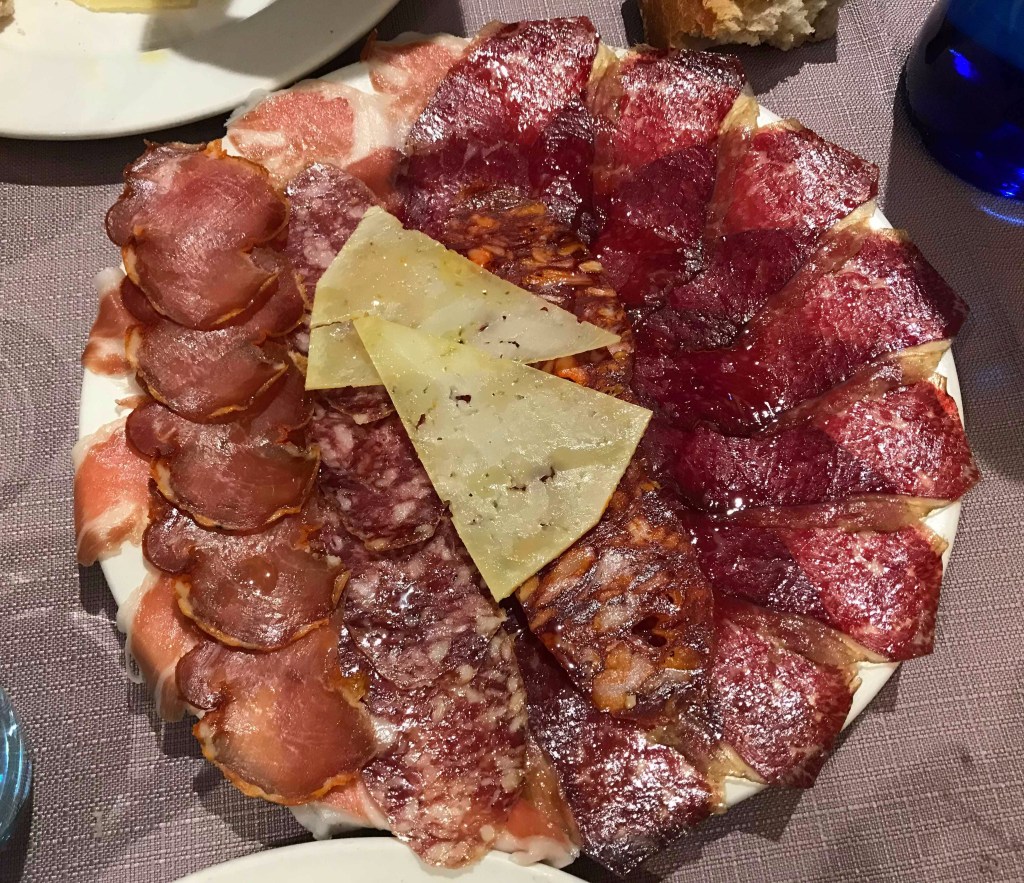 L’appel du ventre se faisant sentir, nous voilà partis à pied dans le centre-ville, à la recherche d’un bon restaurant. En fait, ça grimpe… beaucoup ! Trop tard pour regretter, nous voilà enfin au centre dans la vieille ville après des pauses dans les montées. Nous avons trouvé un restaurant excellent, La Carta de Cimadevilla (C/ Cimadevilla 16, bajo, 33003 Oviedo). Mention pour l’assiette de charcuterie!