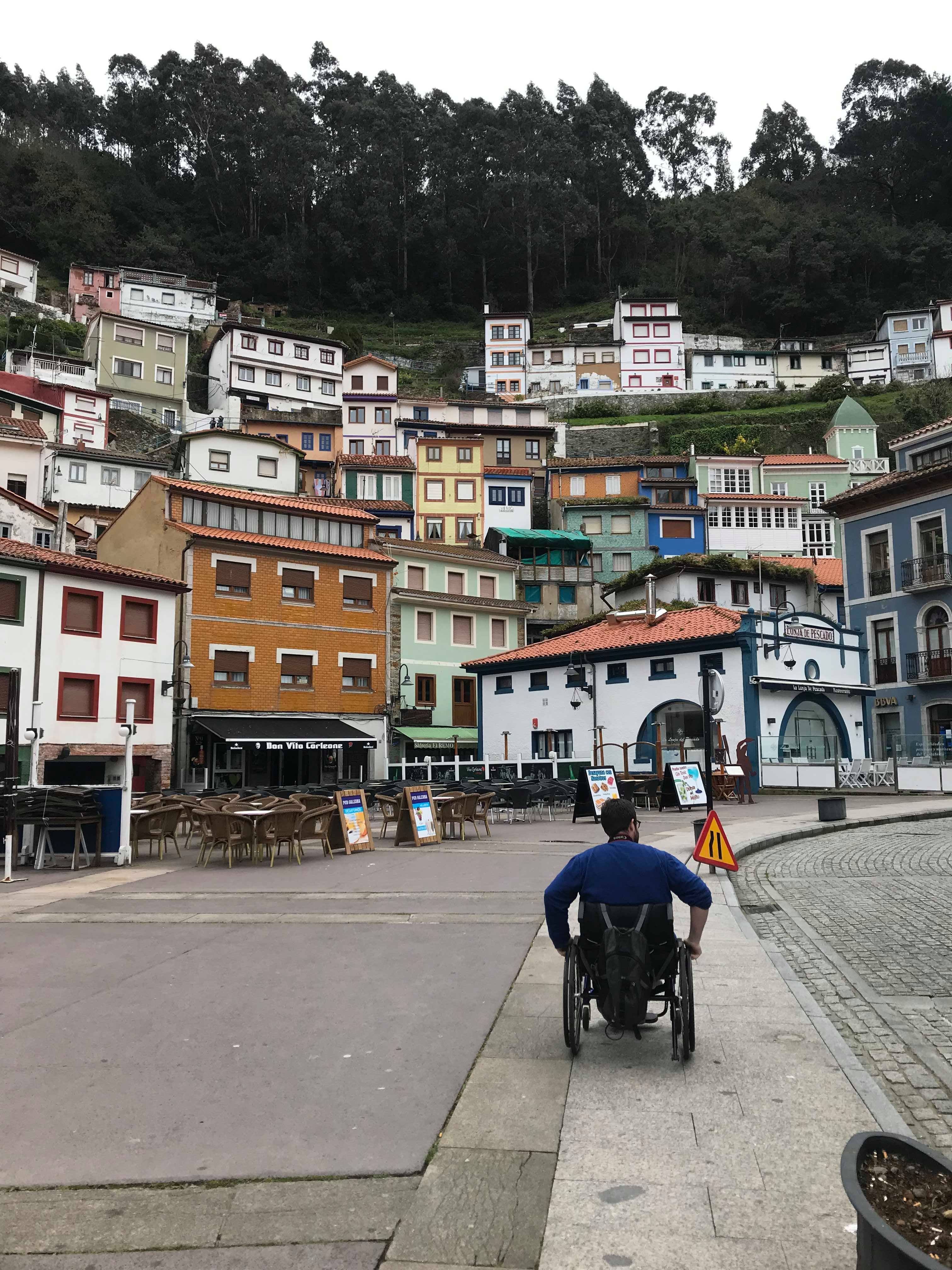 Nous voici ensuite arrivés dans la ville de Villaviciosa. Nous avons flâné dans la ville, pleine de couleurs et assez calme. Beaucoup de pavés, la free wheel a été nécessaire! C’est une roue qui se met devant le fauteuil, surélève les petites roulettes permettant moins de secousses. On vous laisse découvrir les images.