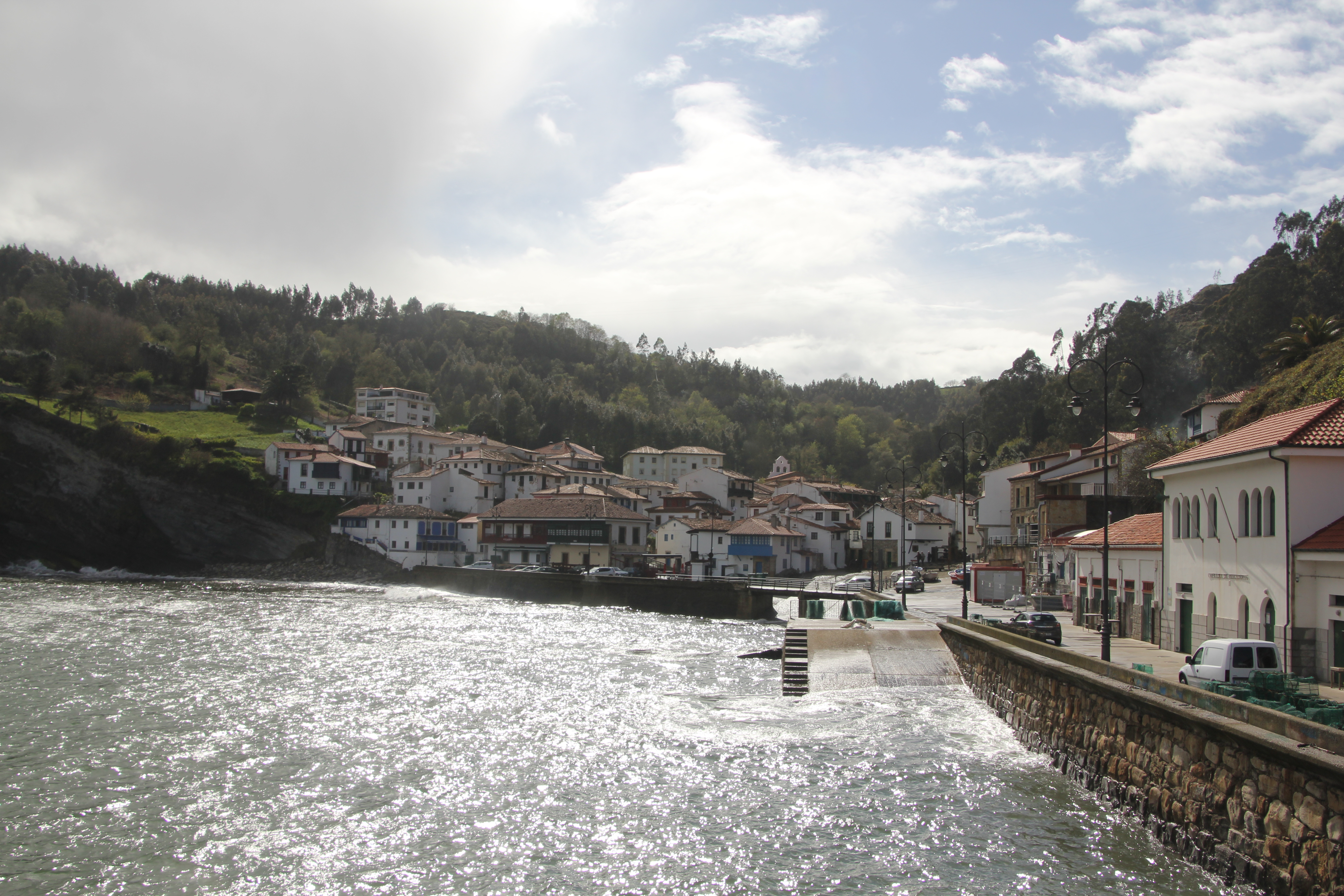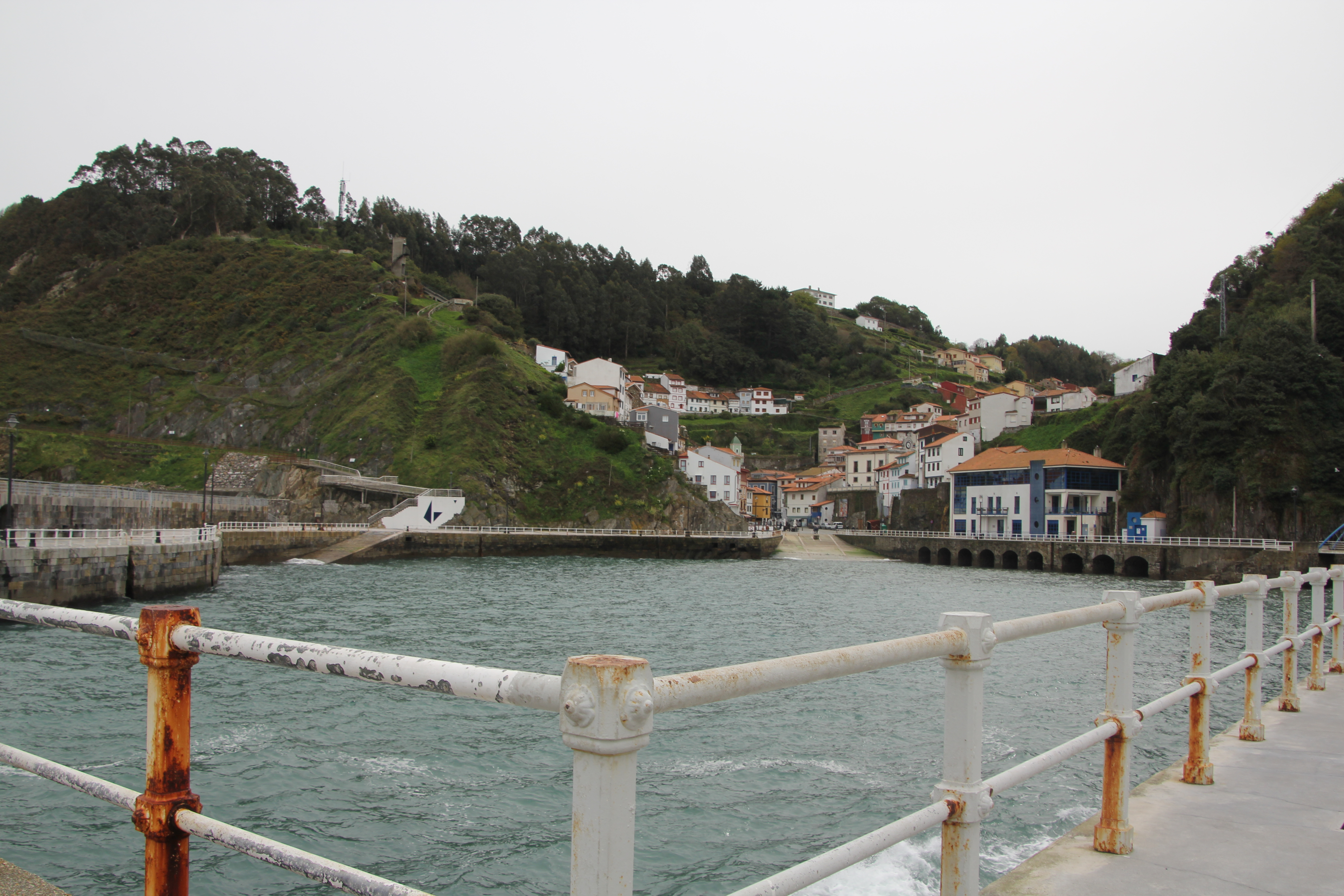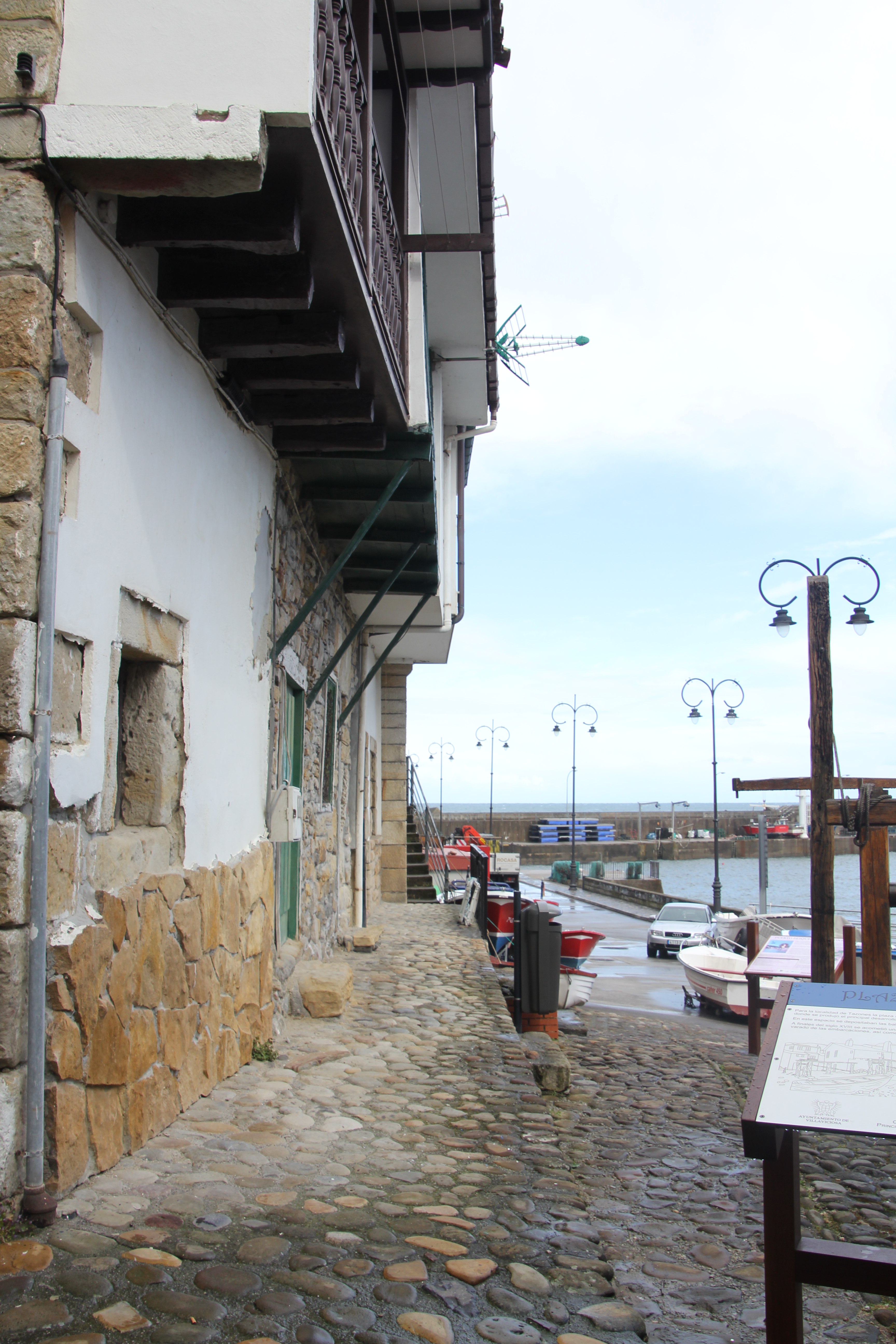Arrivés à Tazones par une route sineuse, nous nous sommes garés le long de la jetée. Il y avait des vagues si hautes que notre voiture a été nettoyée à plusieurs reprises ;). Ici le village est une impasse, pour repartir, il faut faire demi-tour. La ville n’est pas très accessible, cela a été compliqué. De grosses pierres, des montées et des escaliers… et la pluie. Des personnes nous ont aidé à redescendre. La jetée d’où sont prises les photos de l’océan n’est pas accessible (plusieurs marches).