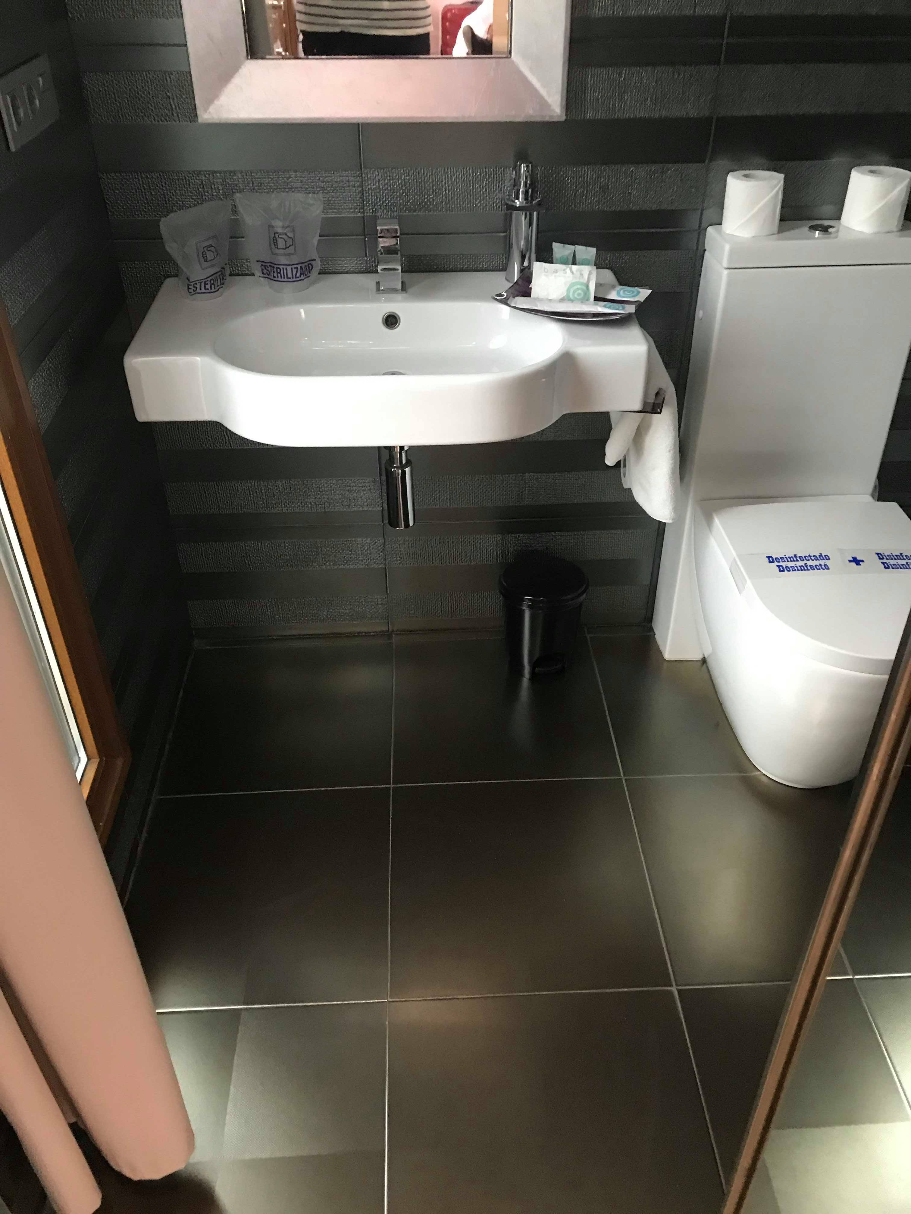 Fatigués de notre périple, nous décidons de rejoindre l’hôtel, le Casas Reais Boutique Rúa das Casas Reais, 29, 15704 Saint-Jacques-de-Compostelle. Et là, surprise, une marche à l’entrée « PMR ». L’hôtelier est très sympathique… mais nous craignons un peu la chambre. Nos craintes sont confirmées quand nous voyons la salle de bain, minuscule! Quelques photos ci-dessous pour vous montrer l’espace dans la salle de bain.