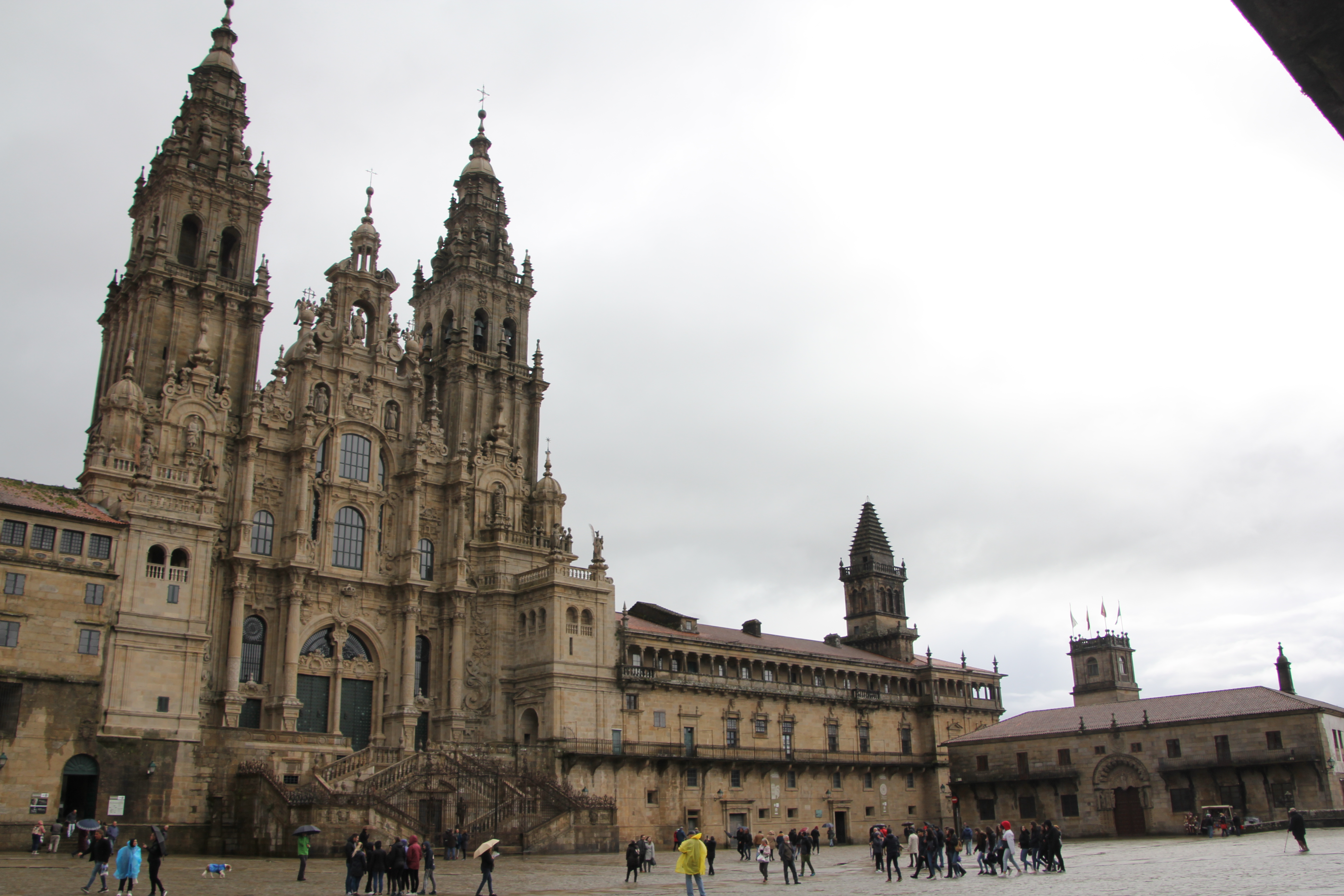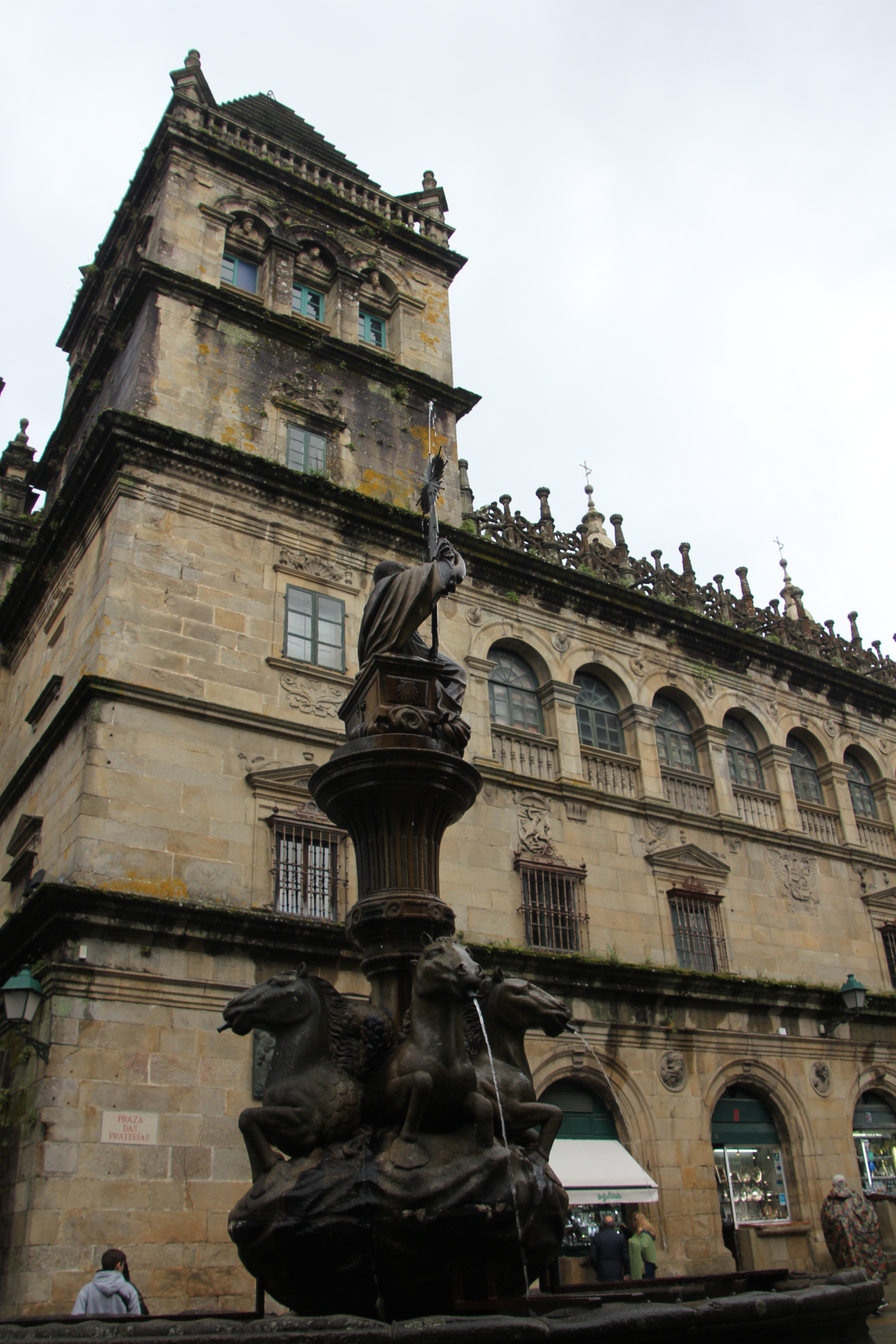 Nous partons à la recherche de toilettes accessibles, il n’y en pas de proches. Enfin si, mais avec une pente de 10% au moins (et il pleut). On renonce alors et on va se réfugier de la pluie dans le Parador de Santiago, connu sous le nom d’Hostal dos Reis Católicos. L’Hostal est né comme Hospital Real en 1499 afin de loger les pèlerins qui se dirigeaient à Saint Jacques. C’est un des rêves des pèlerins et un des emblèmes de la ville, sur la Plaza do Obradoiro. On en profite pour utiliser leurs toilettes PMR, des vrais, des grands, parfaits.