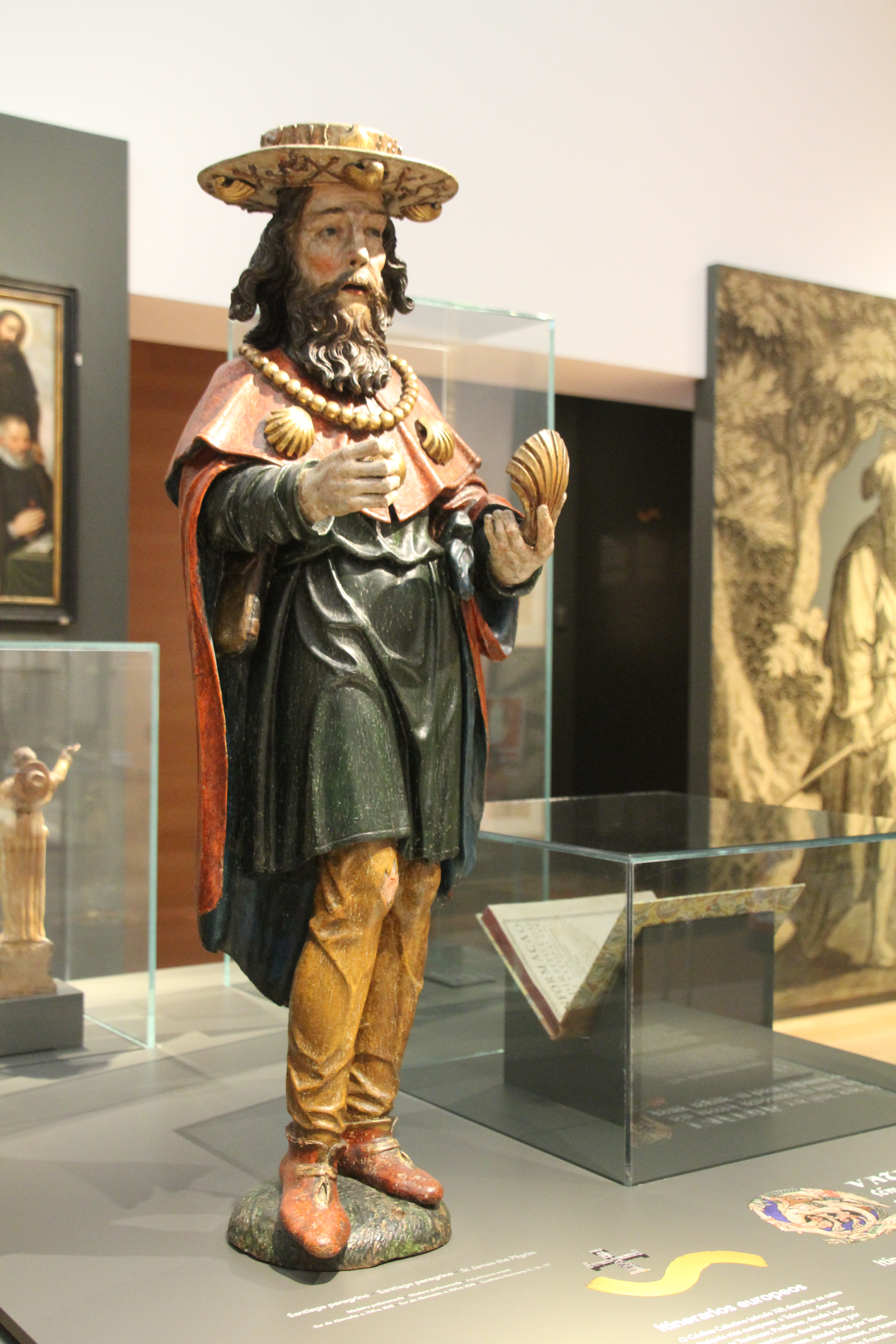 Et nous confirmons ! Tout refait à neuf, le musée est très bien, intéressant et complètement accessible. Son site web ici. Des planches explicatives en français sont disponibles. Voici une statue de St Jacques ci-dessous, facilement reconnaissable avec la conque, son grand chapeau et sa cape.