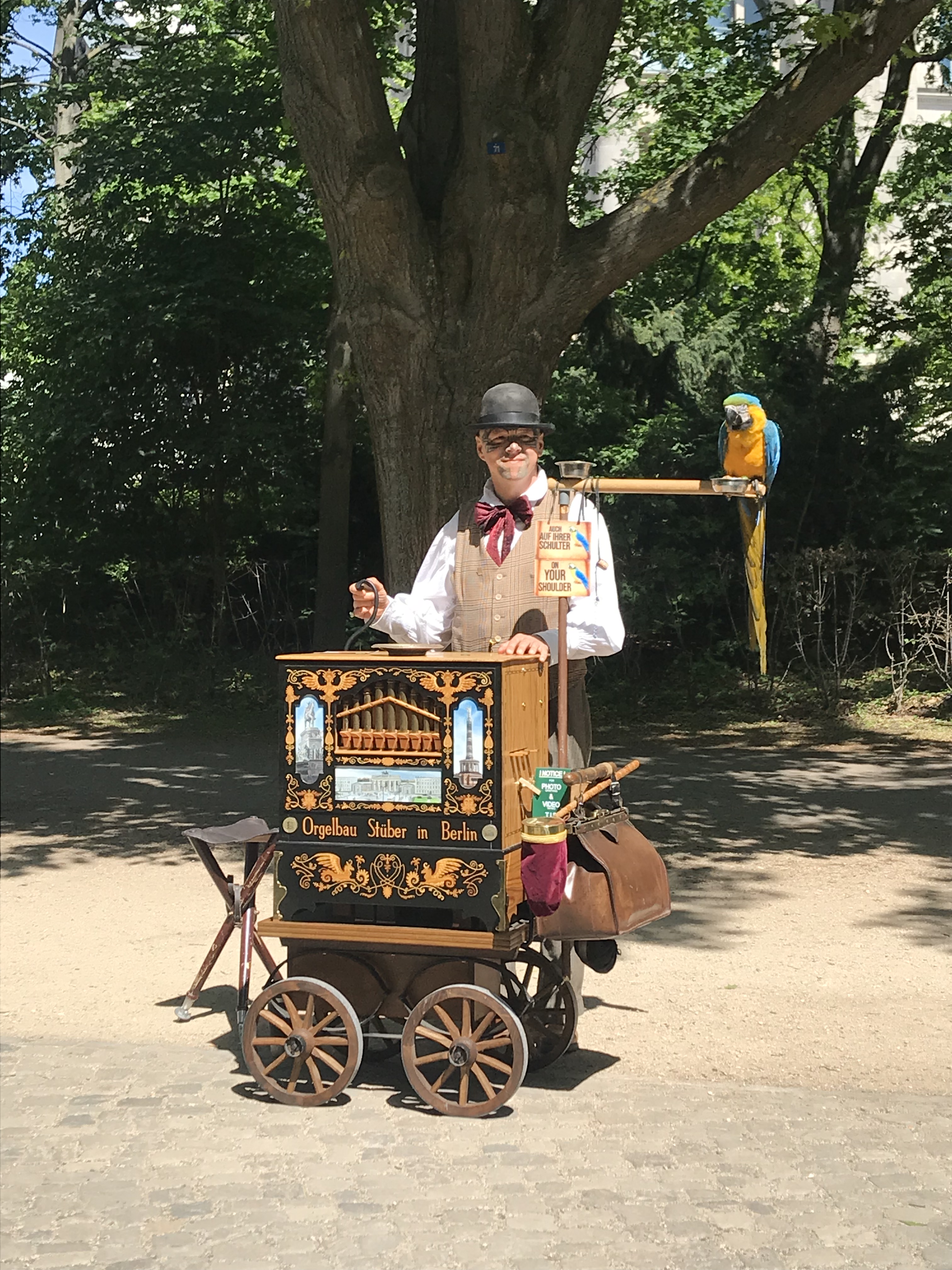 Nous avons alors continué notre chemin par un petit parc où nous avons croisé un drôle de monsieur… avec son perroquet et son orgue de barbarie! La preuve en photo: