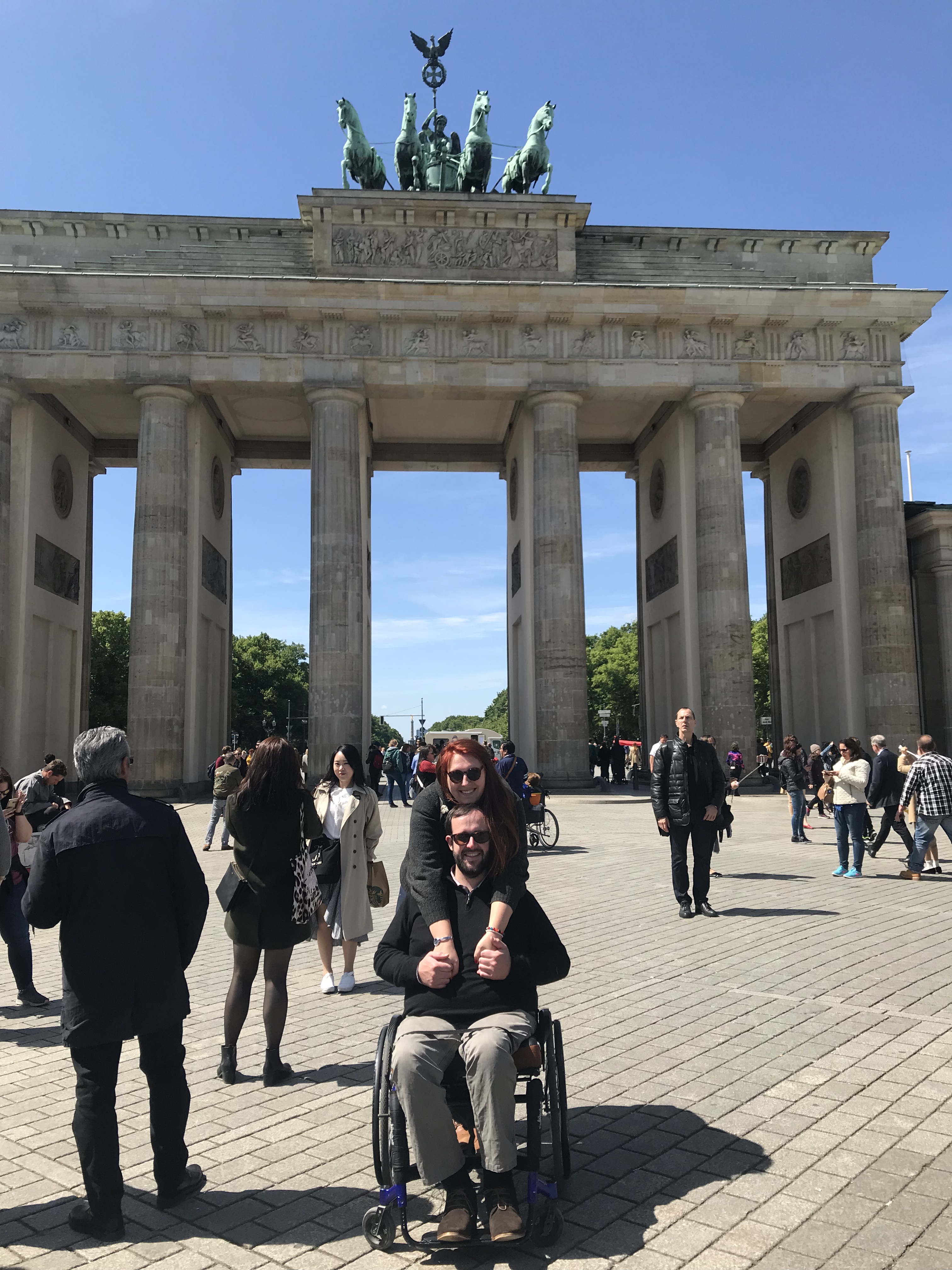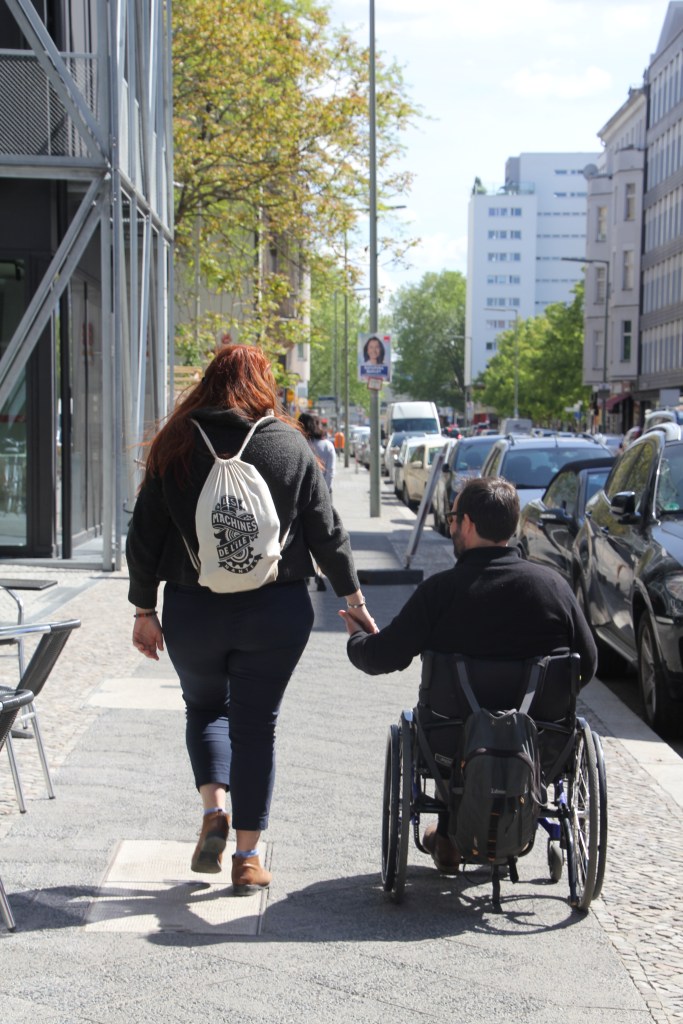 Nous sommes arrivés à Berlin Tegel avec Easyjet. L’assistance n’a pas été la même au départ et à l’arrivée… à Montpellier, Géraud a été transféré dans un fauteuil puis soulevé sur la vingtaine de marches de l’escalier. Oui oui soulevé! Entre temps, le fauteuil étiqueté a été emmené pour voyager dans la soute. À Berlin, ils sont venus nous chercher dans une navette spéciale, un « camion-bus » avec une plateforme élévatrice. C’était niquel. Les hommes ont commencé à nous parler en allemand, c’est bon nous étions arrivés au bon endroit! Ils nous accompagné jusqu’au tapis roulant et ont même choppé nos valises. Nous nous sommes débrouillés pour trouver la sortie, qui était toute proche. C’est nous qui leur avons dit que nous pouvions nous débrouiller, sinon ils nous amenaient jusqu’au taxi!
