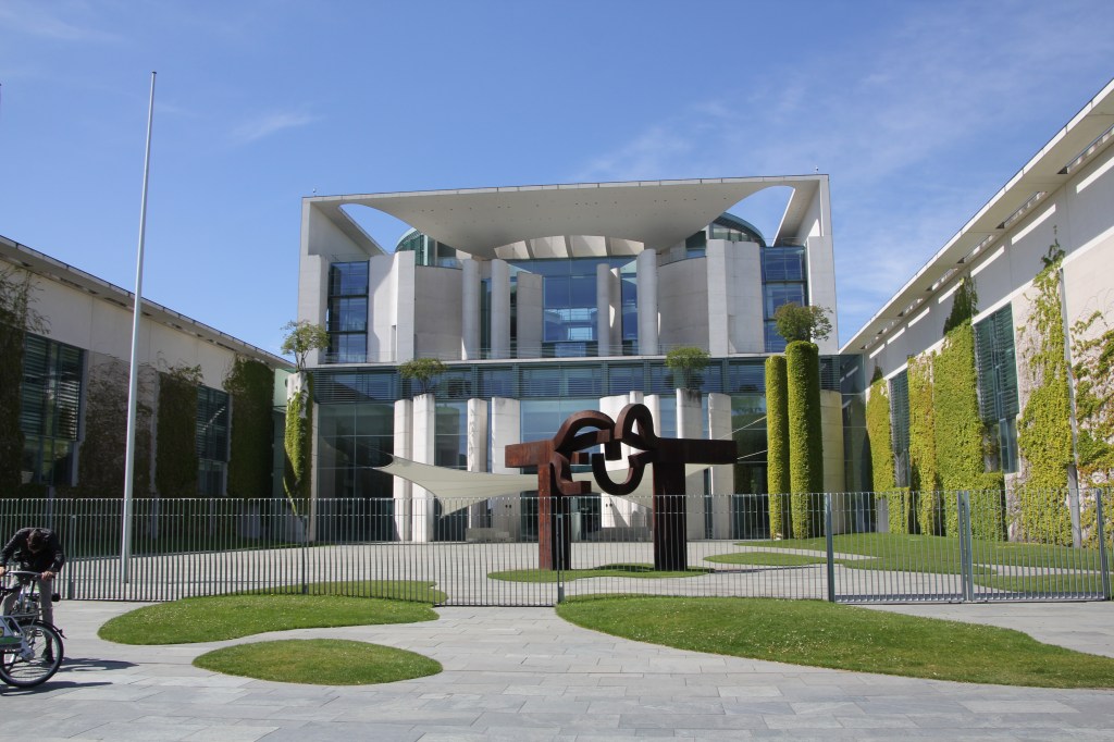 Nous avons ensuite longé la Spree et nous sommes arrivés dans le quartier du pouvoir politique allemand. Très chic, très propre. Nous nous sommes présentés au contrôle de sécurité en présentant le mail de confirmation de réservation. Après quelques secondes d’ascenseur (où une dame a le job d’appuyer sur les boutons..!!), nous voici en haut. Tout est accessible.