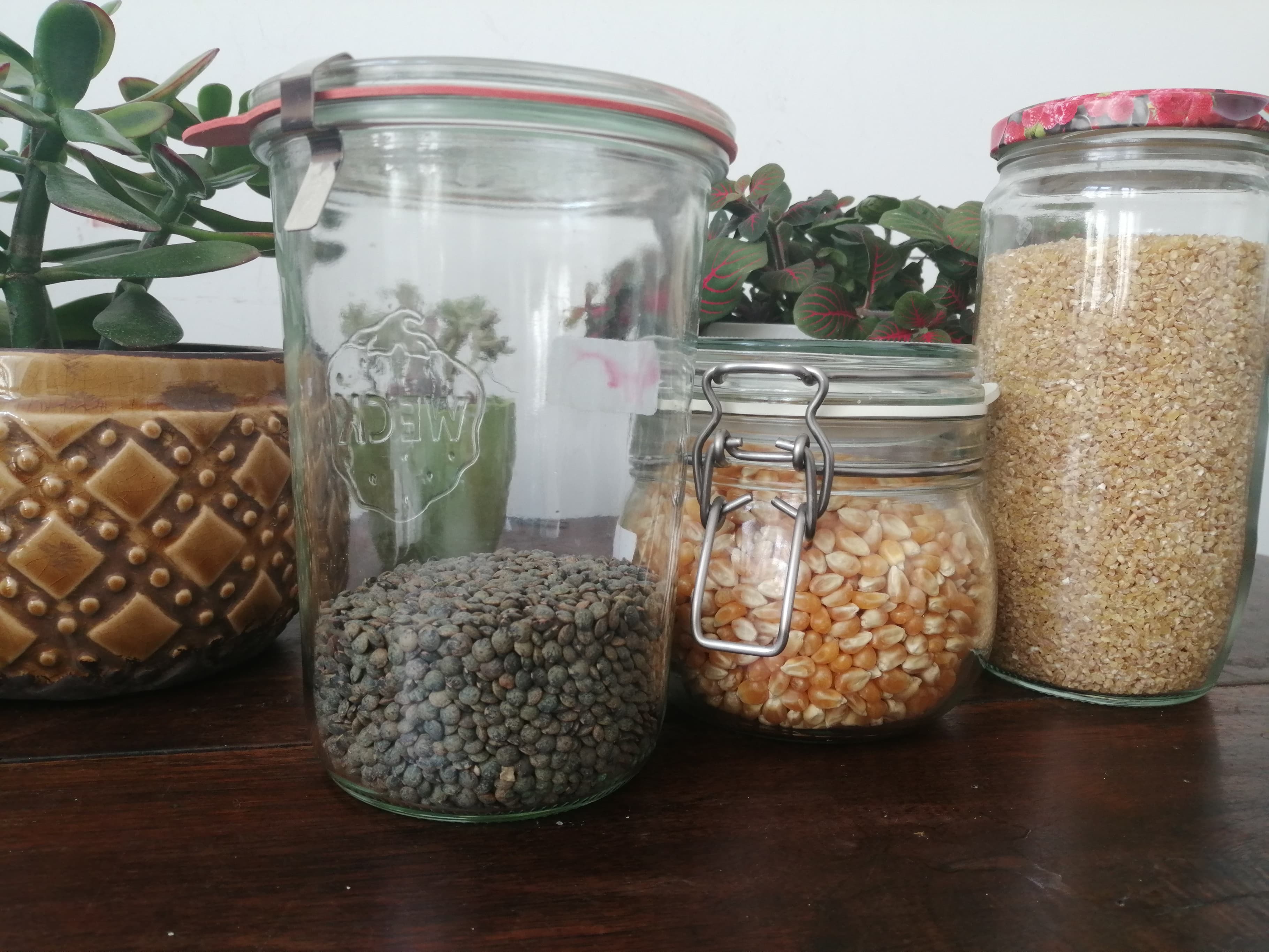 • Nous utilisons de nombreux bocaux en verre pour stocker le sec et les confitures que nous confectionnons (ou qu’on nous offre ;)), ou encore les graines de courges séchées qui seront sur la table des prochains apéros