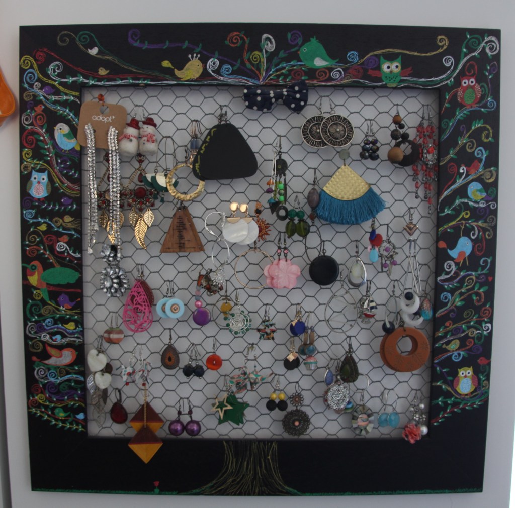 • Le cadre à boucle d’oreille d’Elisa a été fait par nos soins. Cadre Emmaüs, grillage récupéré à la ferme, peinture fait à la main :). Concernant les boucles d’oreilles, certaines viennent de grandes marques (comme vous pouvez voir sur la photo), Elisa privilégie aujourd’hui les boucles d’oreilles artisanales et faites main. Dernier achat en date : des magnifiques oreilles Origami des Ptits Doigts de Cé. Nous en achetons aussi au bal des créateurs.